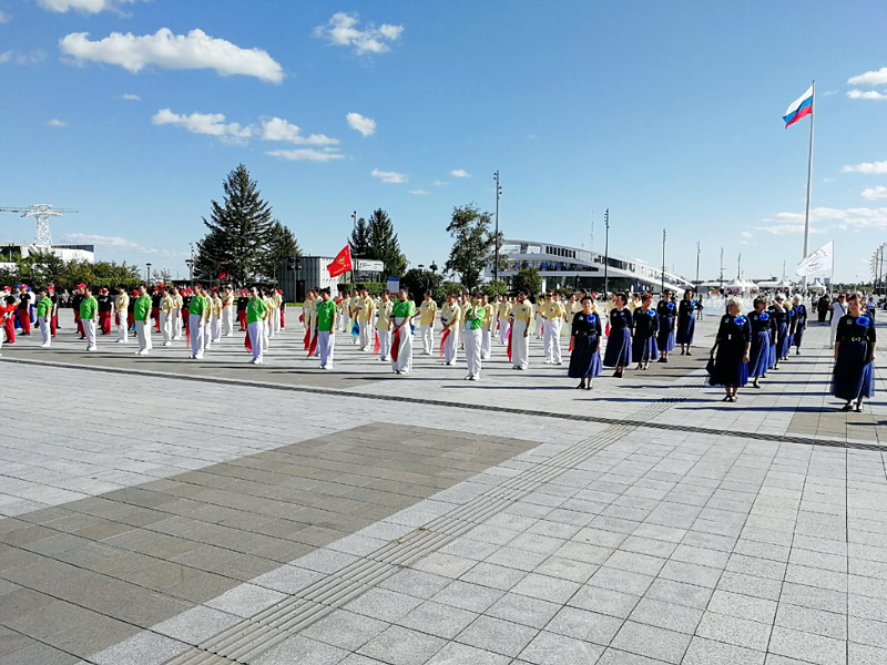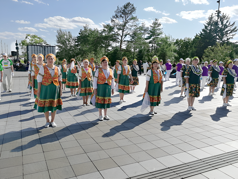 На площади одновременно танцевали 320 человек старшего возраста, создавая невероятную атмосферу дружбы и единства. После совместных выступлений каждая команда представила свой уникальный танец, добавив разнообразие и красочность в общий праздник.