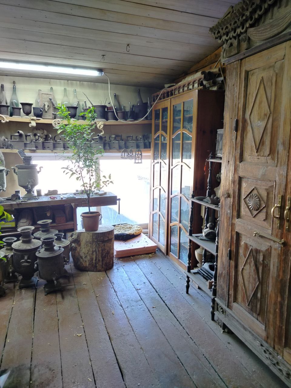 Это место - мастерская Александра Владимировича. В чем заключается уникальность, казалось бы совсем не экскурсионного объекта? Дело в том, что именно в мастерской Александр Владимирович хранит свои коллекции предметов, собранных им в течение 35 лет на развалинах деревянных домов Благовещенска.