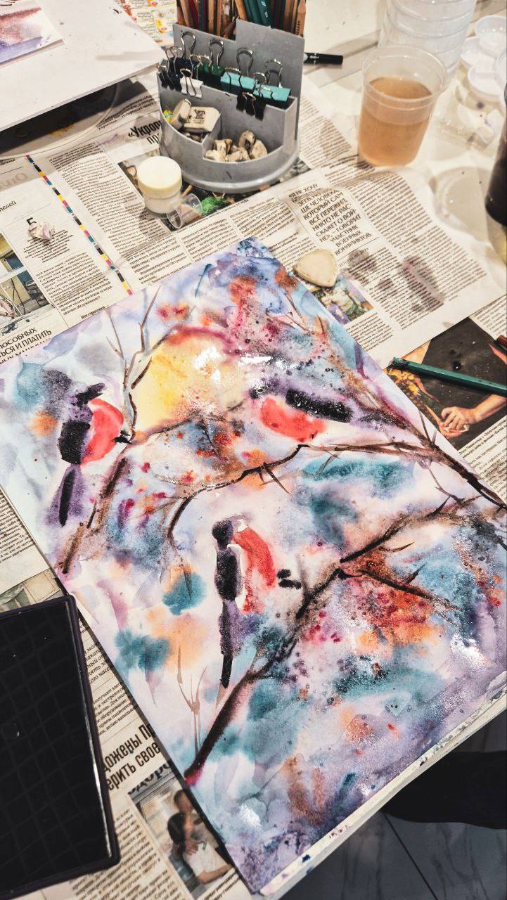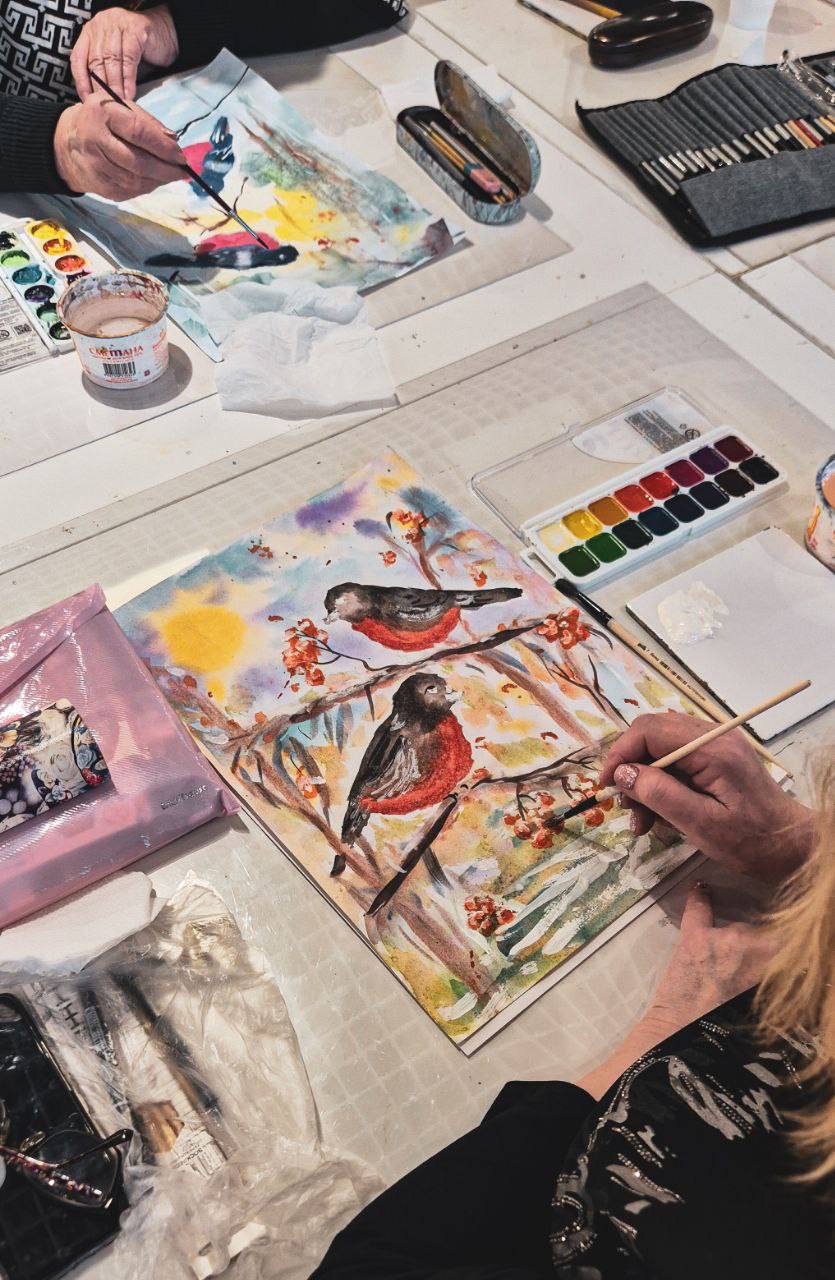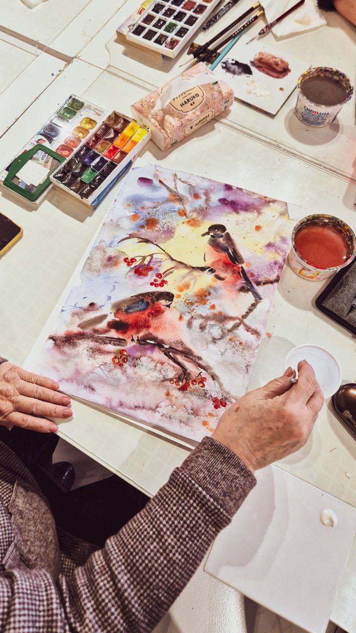 Долголеты писали снегирей — зимних птиц, символов праздника и зимнего уюта. После основных очертаний мы доработали изображения с помощью белой гуаши, добавляя светлые штрихи, объем и мягкость. Для создания эффекта снега и зимних набрызгов мы использовали технику набрызга — аккуратное распыление краски из кисти, что придало работам особую воздушность и зимнюю атмосферу.