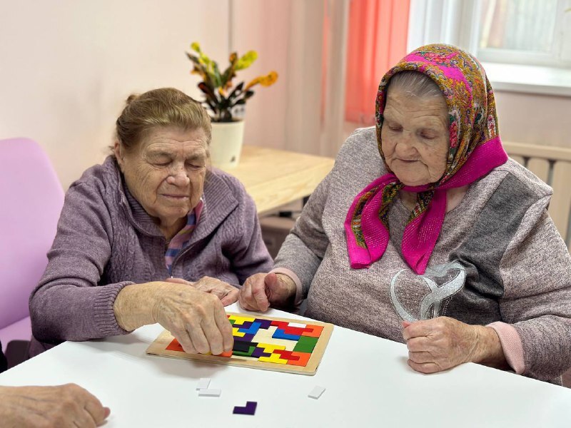 Долголеты решают различные головоломки, среди которых: магнитные лабиринты, металлические головоломки, межполушарные доски, квадраты Никитина, рамки-вкладыши и другие полезные пособия.